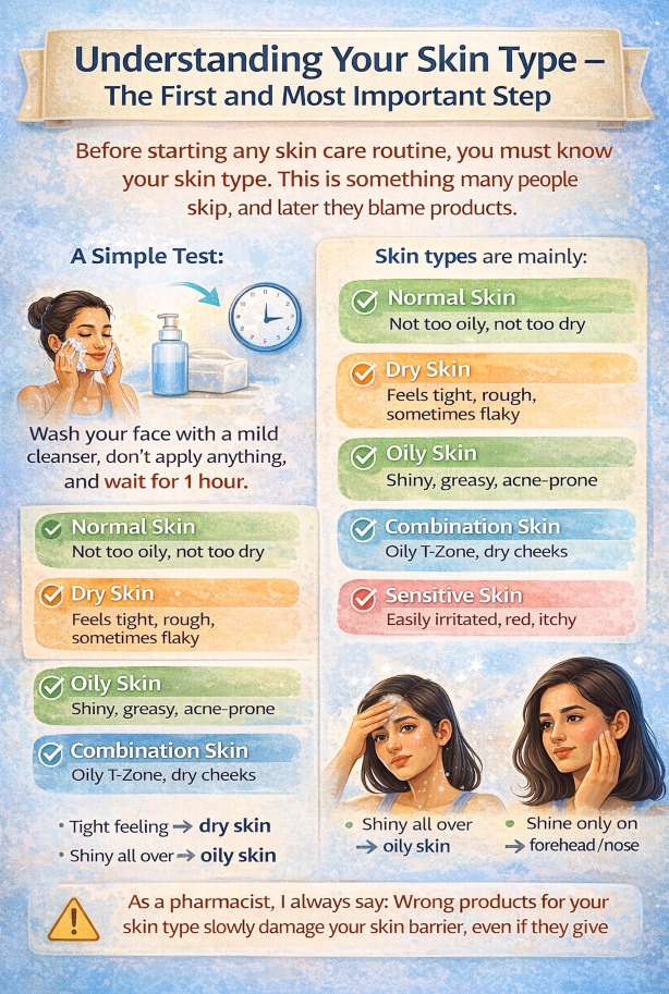 Before starting any skin care routine, the most important thing you must understand is your skin type. As a pharmacist, I see many people using expensive products that are completely wrong for their skin, and then blaming the brand or their skin.
