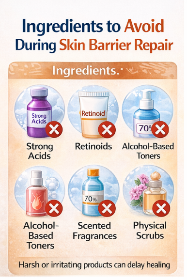 When your skin barrier is damaged, what you avoid is just as important as what you use. Many people unknowingly slow down healing by continuing ingredients that irritate or overstimulate the skin.